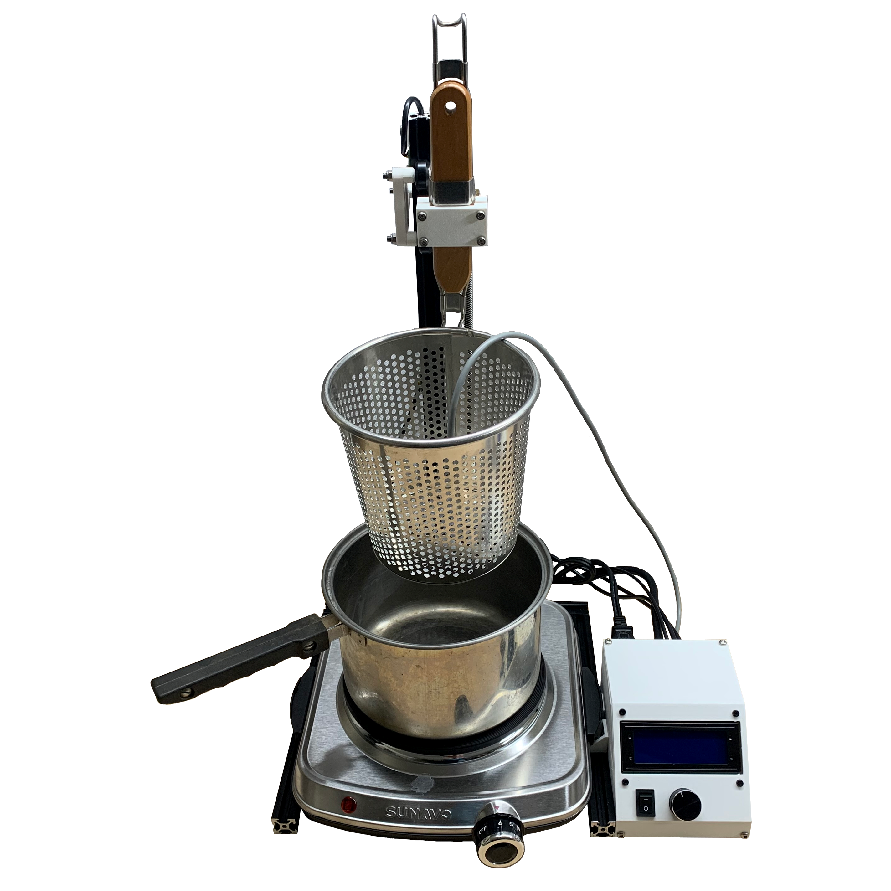 BoilerBot automatically brings water to a set temperature, lowers food into the water for a set time, and raises the food back out.